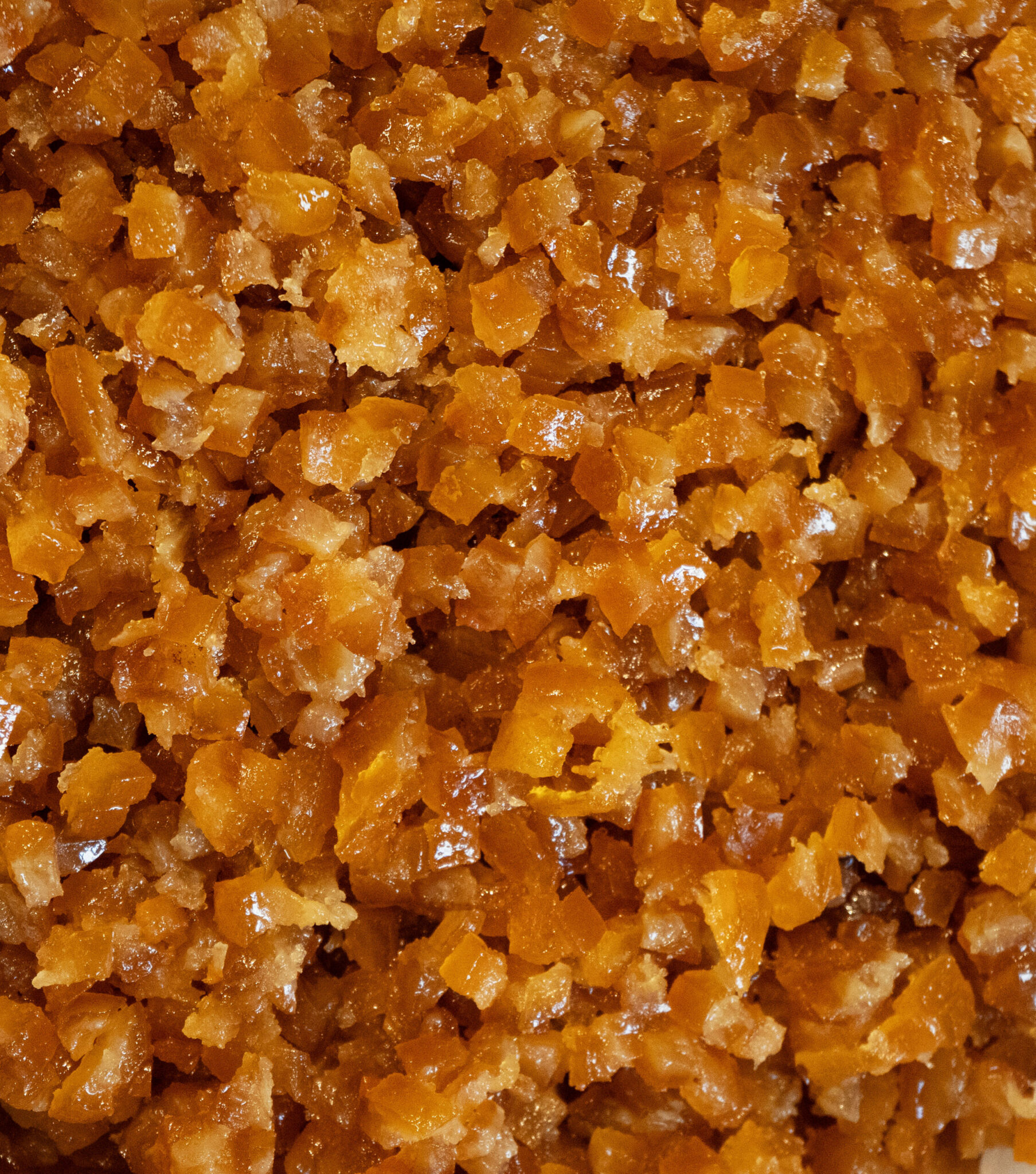 Verarbeitung: Handwerklich kandiert in Wasser-Zuckersirup-Bad bei niedriger Temperatur