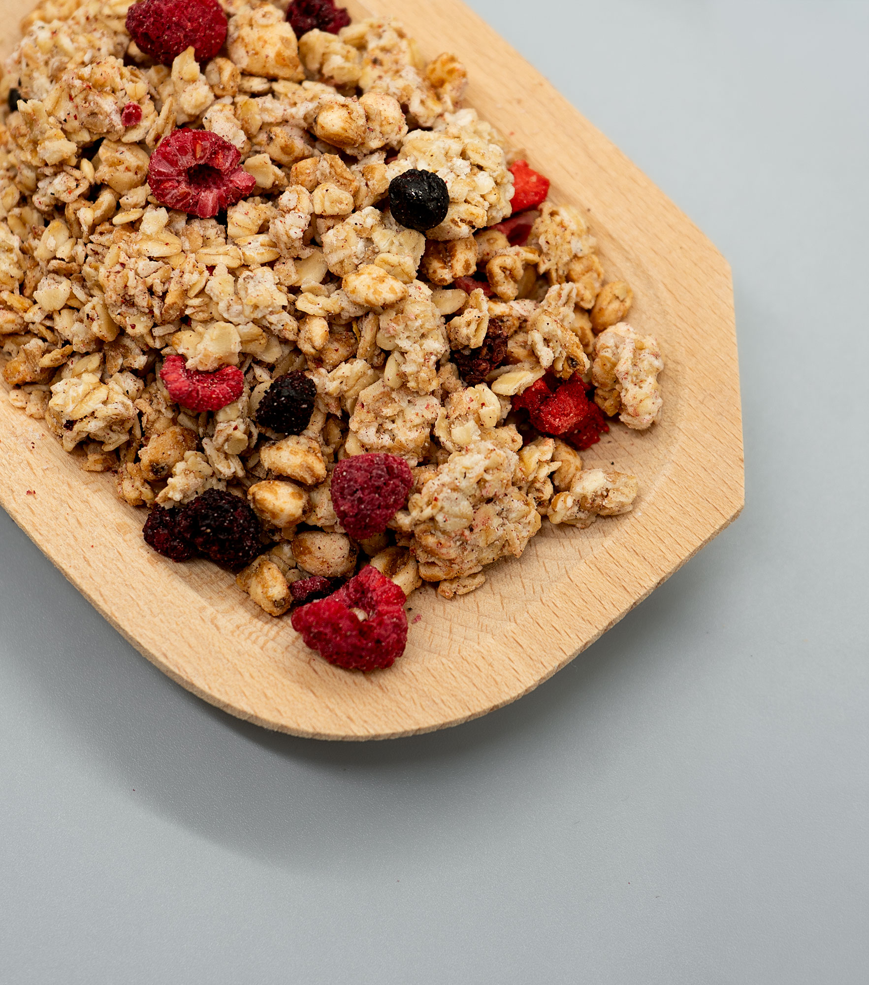 Haferflocken* 45,5%, Rohrohrzucker*, Weizenflocken* 10,8%, gepuffter Hartweizen* 9,5%, hocholeisches Sonnenblumenöl*, getrocknete Kokosraspel*, Frucht-Mix* 2% (Himbeeren*, Brombeeren*, Erdbeeren*, Heidelbeeren*, in variabler Zusammensetzung), Salz, Antioxidationsmittel: Tocopherolreiches Extrakt*