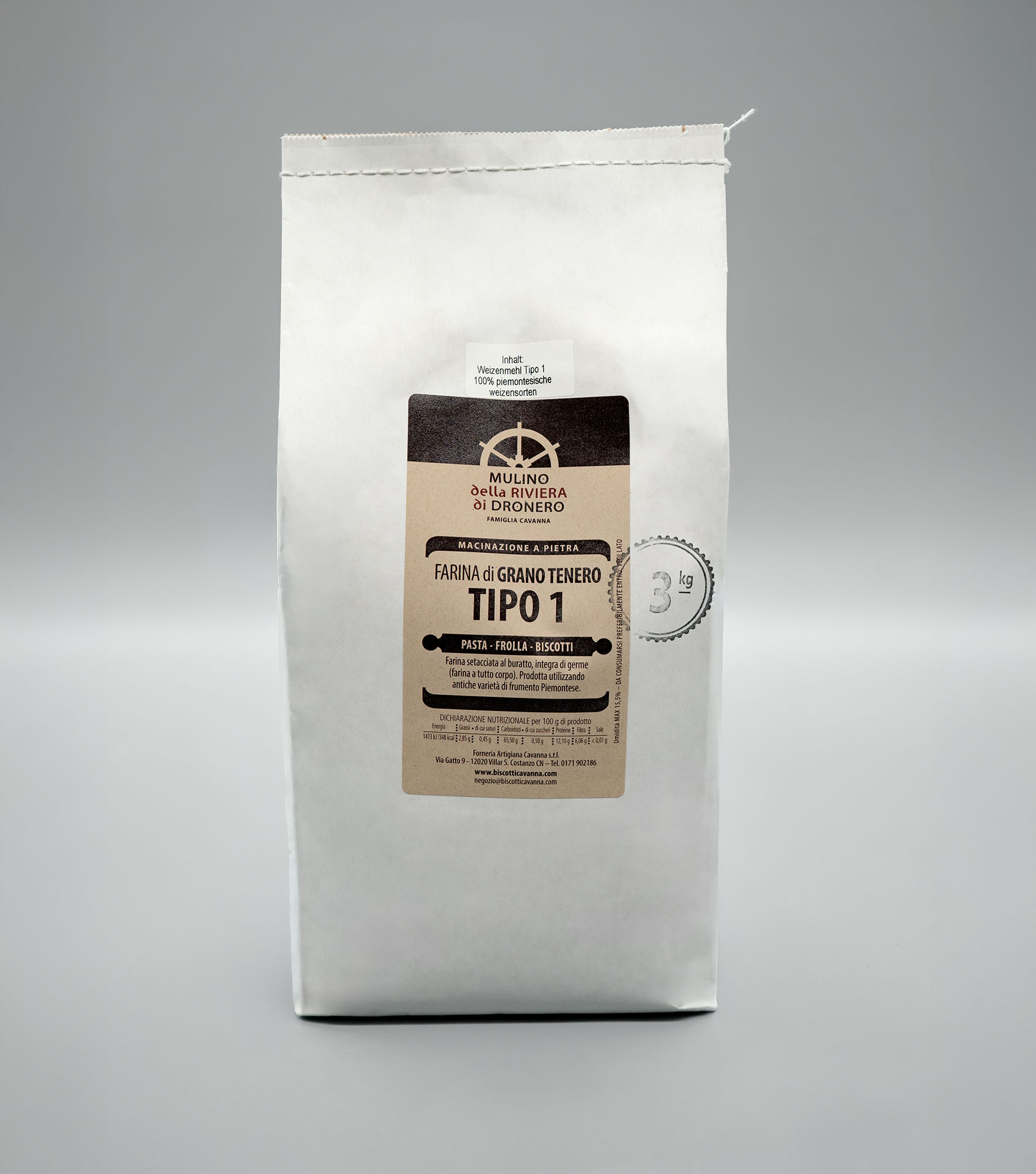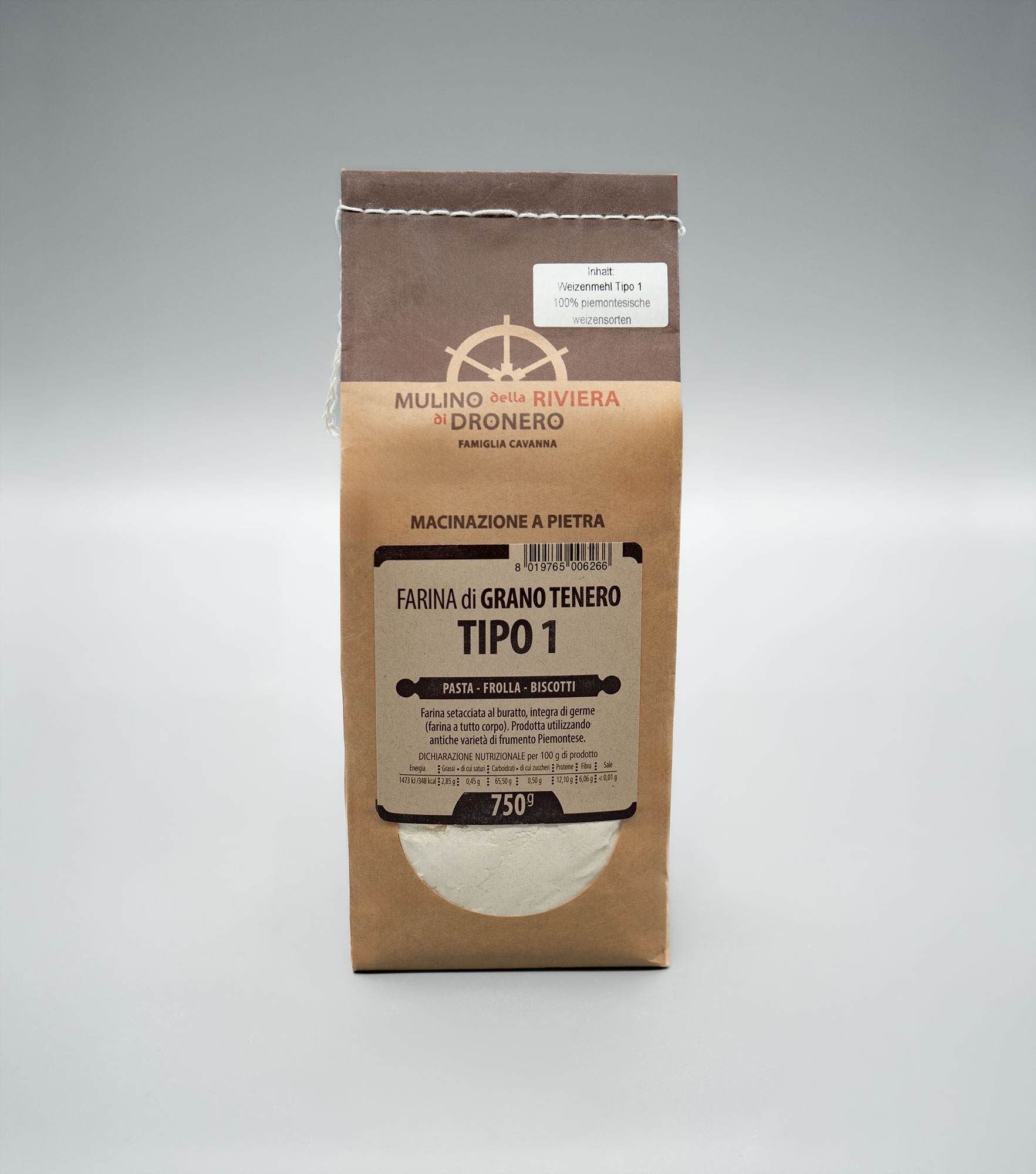 Für dieses Weizenmehl der Mühle Mulino della Riviera di Dronero werden ausschließlich alte piemontesische Getreidesorten vermahlen. Es besteht aus sieben bis acht verschiedenen Weichweizensorten, die im Piemont, teilweise sogar von benachbarten Kleinbauern der Steinmühle, angebaut werden. Das Mehl hat einen niedrigen Glutengehalt und einen hervorragenden Geschmack. Durch das schonende Mahlverfahren mit Naturstein und die sanfte Wasserkraft des Mühlbaches können die natürlichen Nährstoffe des Mehls und der Keimling erhalten bleiben. Der Mineralstoffgehalt entspricht in etwa dem österreichischen Weizenmehltype W700, bzw. dem deutschen Type 550 und kann sowohl in Broten als auch in feinen Backwaren und Keksen verwendet werden. Sehr gut geeignet ist dieses Mehl durch den niedrigen Glutengehalt auch für die Zubereitung von Pasta. Ideal für Fans von Urkorn und raren Getreidesorten.